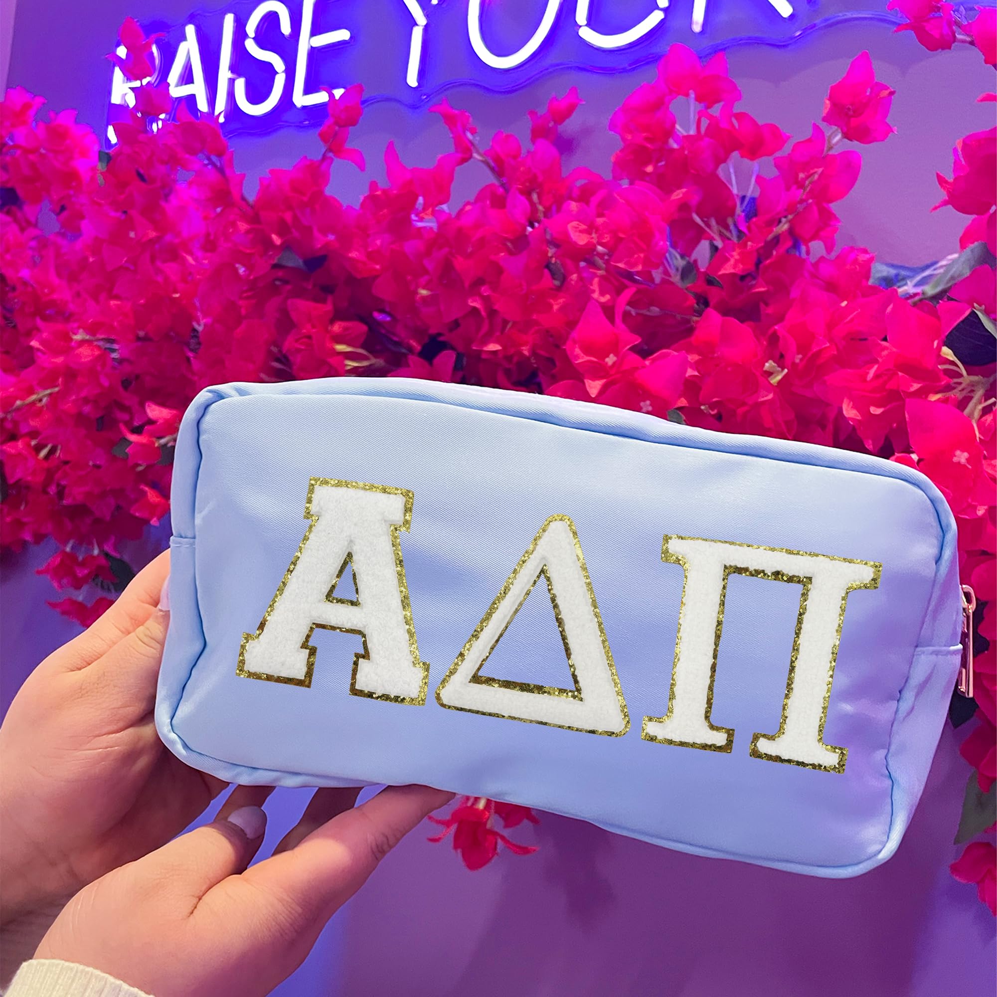 Alpha Delta Pi Nylon Makeup Travel Bag, Glitter Greek Letter Patch, Cosmetic Case - Blue - ΑΔΠ