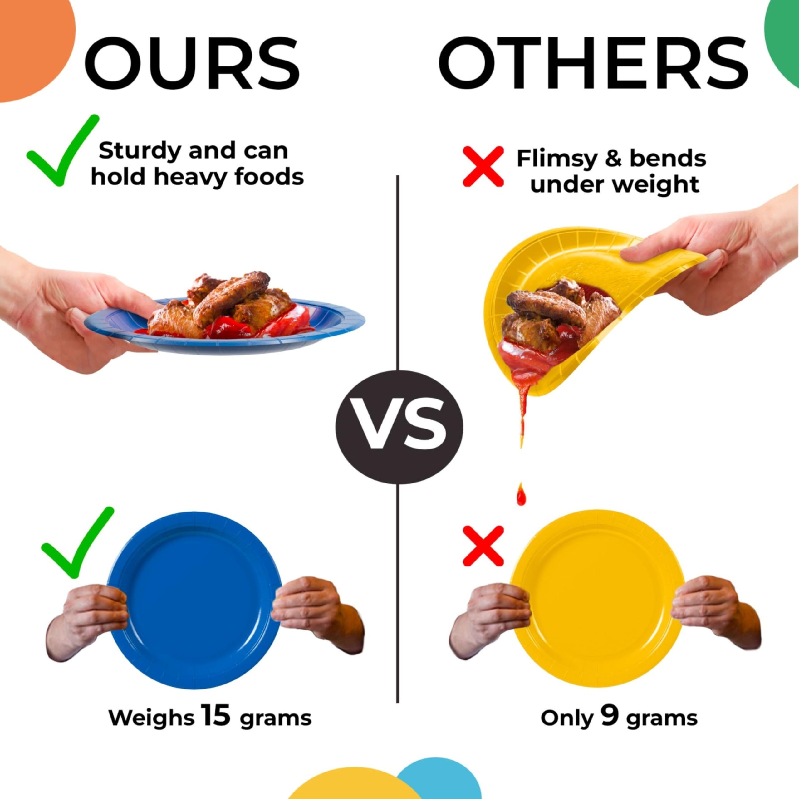 - Strength & Durability - These premium quality light blue paper plates heavy duty are built strong. With their superior strength, you won’t need to worry about your paper plate buckling under the weight of your food. Enjoy our reliable plates disposable heavy duty that outperform other flimsy alternatives.